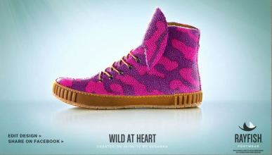 My boyfriend introduced me to this SUPER COOL groundbreaking concept which allows people to bio-custom design their own sneakers with stingray leather. As sea creatures, I believe its a natural defense mechanism which allows these animals to camouflage their skin to any background (like a chameleon!) and this allows the makers of these sneaker to farm the stingrays for leather and create any kind of print you wish! I heard that these are impossibly expensive at a few thousand a pop, but the idea is cool. You can even use their online custom design tool to see what your sneakers would look like. I designed a pair myself below which I titled “Wild at Heart” which I think is fitting. Of course the idea of poor little stingrays being farmed for my sneakers is kind of sad, but leather booties are no different, and at least stingrays don’t emit as much Co2 into the atmosphere as cows do. Tell me what you think of my design. I think you win your own custom pair of sneakers if you get enough votes on the website. Checkout RayFish Footwear!